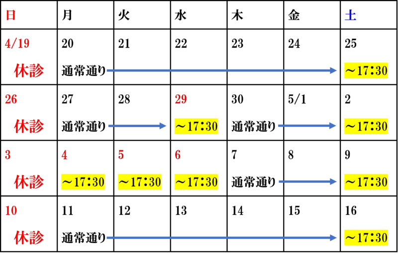 ゴールデンウイーク中も診療を行いますが、5月3日(日)は休診とさせていただきます。